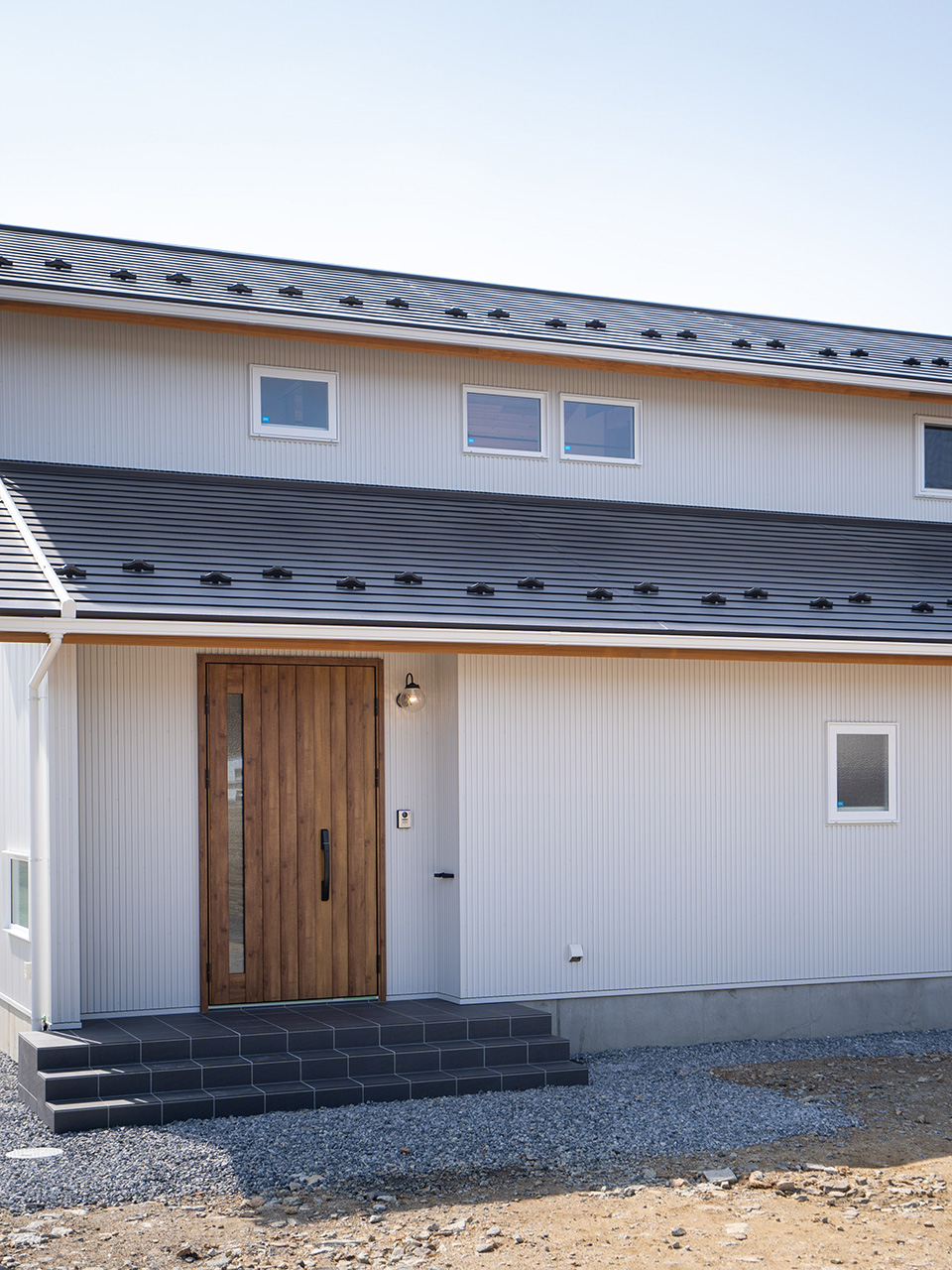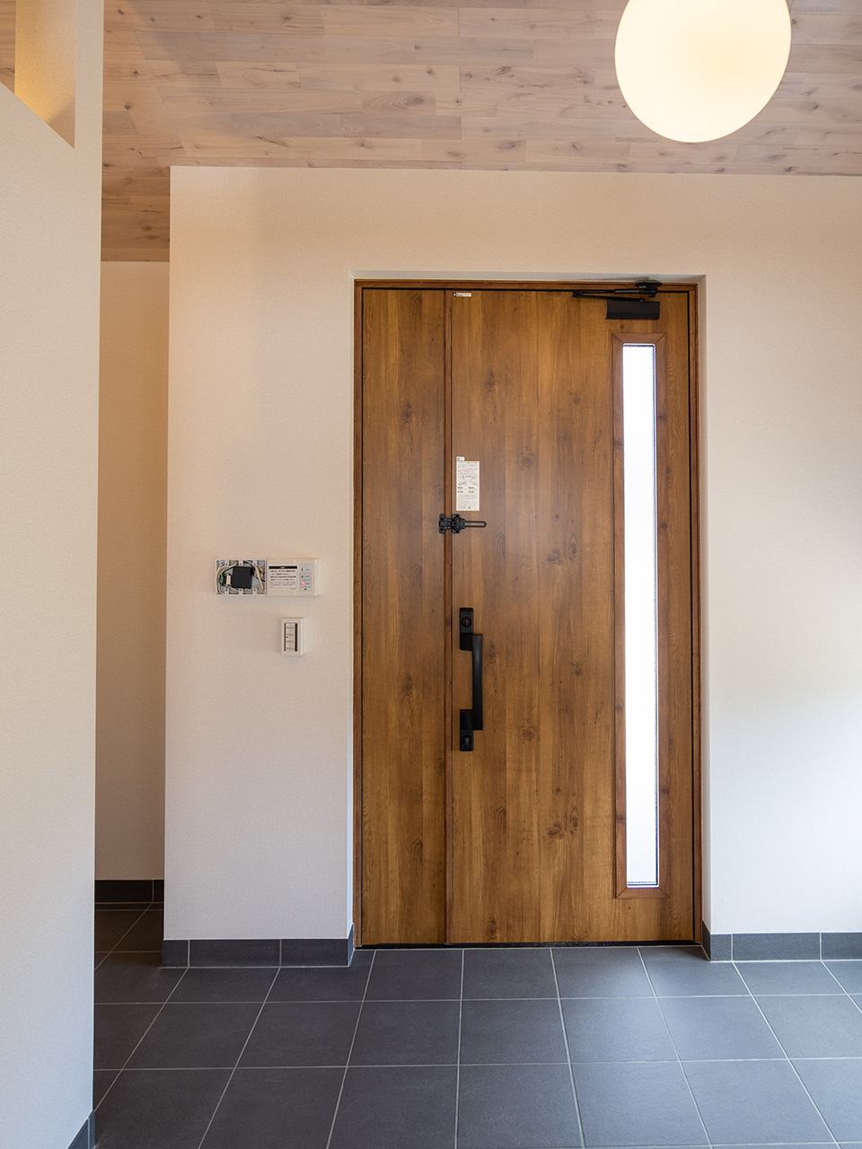 雨の日でも濡れることなく出入りできるように、玄関庇を大きめに設けました。