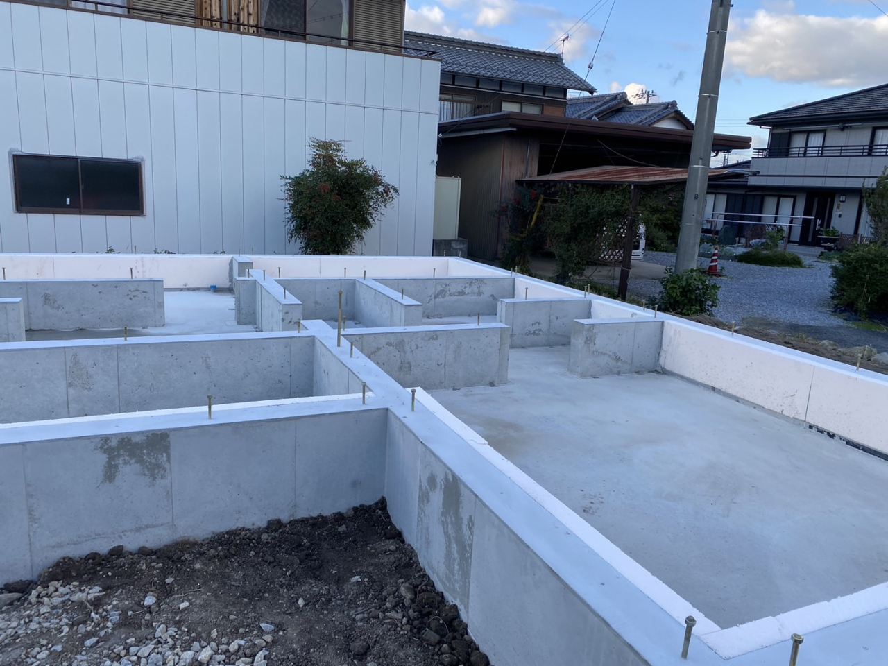 ベースと立ち上がり部分に打ち継ぎがなく、シロアリの侵入を防ぎ構造上に強いベタ基礎一体打ち工法を採用。