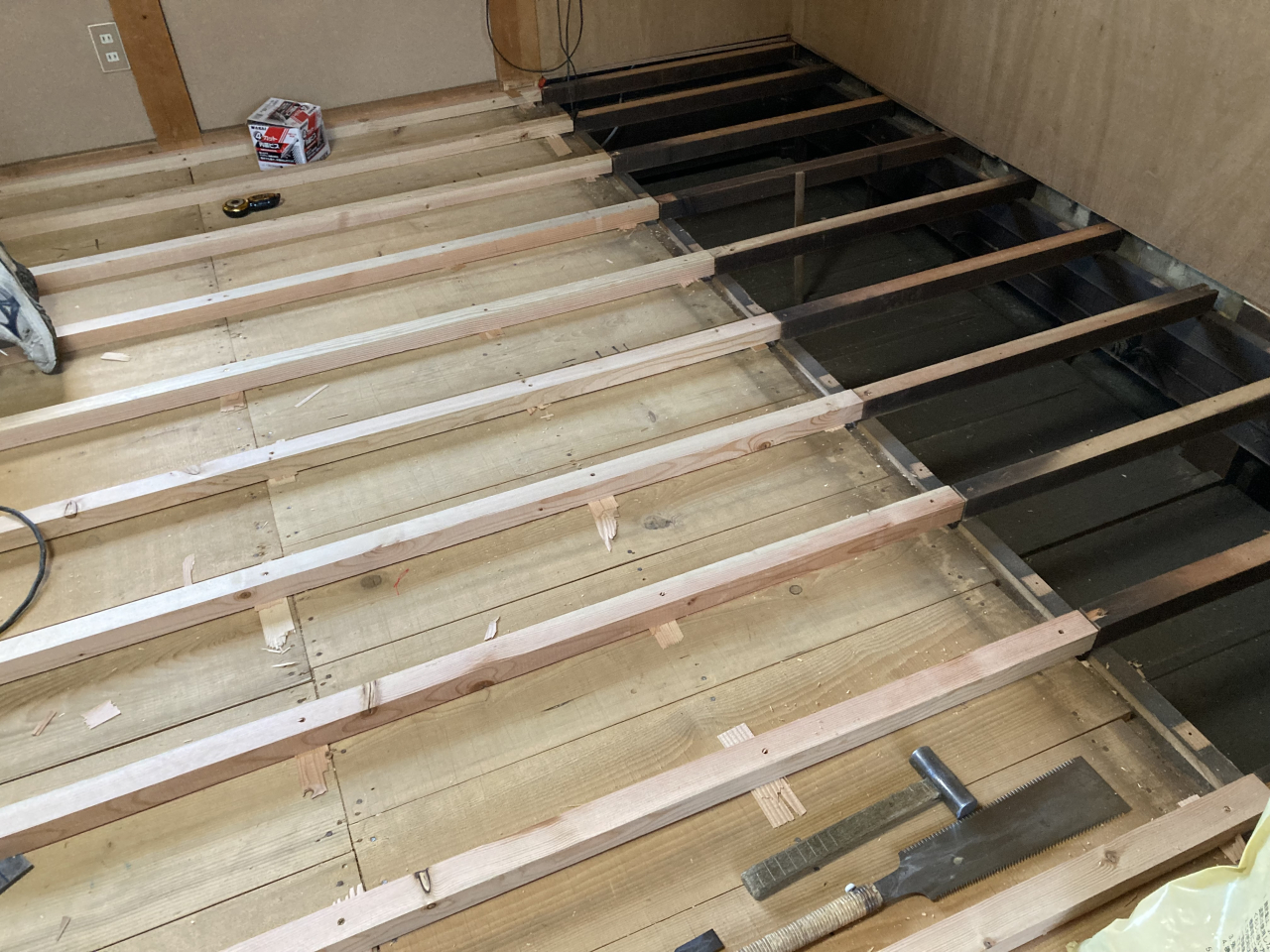 既存の床板に垂木を流して高さを合わせて、フローリングを張っていきます。