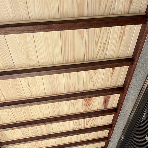 垂木と垂木の間に、一枚づつ杉の羽目板を張っていく施工は、手間と根気が必要です。